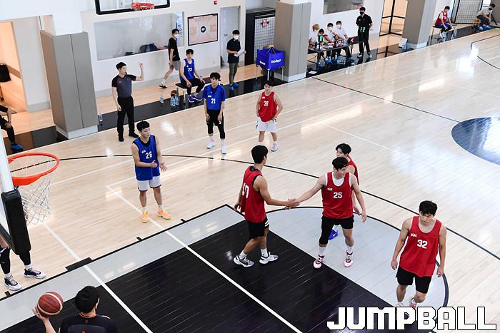 [점프볼=서울/박상혁 기자] 3일 서울 동대문구에 위치한 토모클럽 짐에서 '2021 KBL 신인선수 드래프트 일반인 실기테스트'가 열렸다. 레드팀 선수들이 하이파이브를 하고 있다.