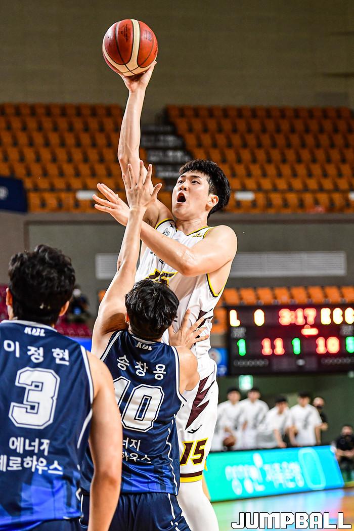 [점프볼=상주/박상혁 기자] 11일 경상북도 상주시 상주실내체육관에서 열린 '2021 MG새마을금고 KBL컵 대회' 창원 LG와 전주 KCC 경기, LG 김준일이 훅슛을 시도하고 있다.
