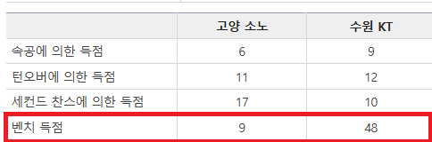 그 결과 소노가 벤치 득점 9점을 기록하는 사이 KT는 이두원(11점)과 정창영(8점), 김선형(6점) 등의 득점도 더해져 무려 48점이 벤치에서 나왔다. 이 차이는 39점에 달했지만, 소노의 빅3 화력을 넘어서기엔 역부족이었다.