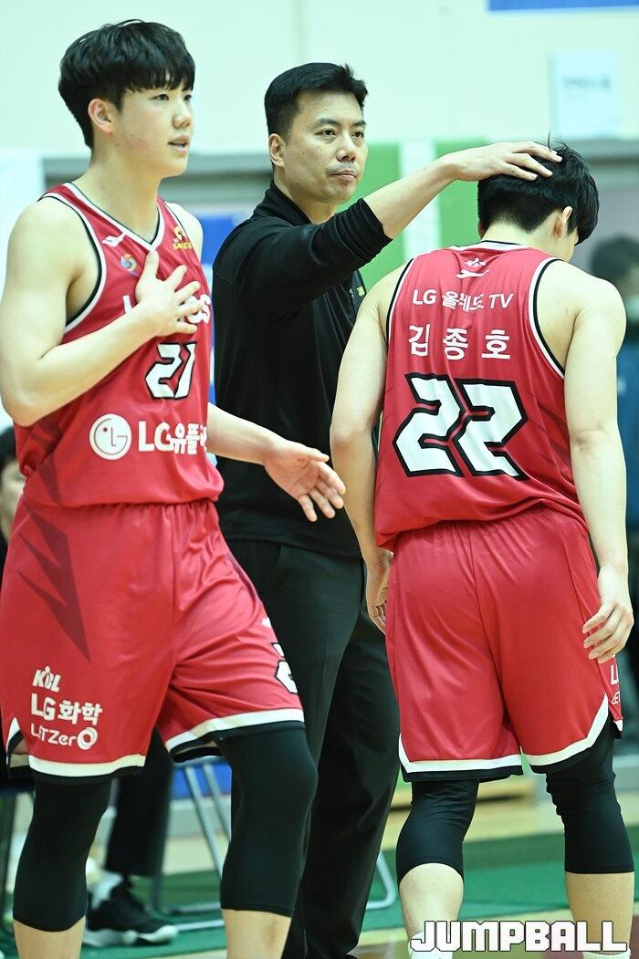 21일 이천 LG챔피언스파크에서 열린 2022-2023 KBL D-리그 창원 LG와 수원 KT의 플레이오프 경기, LG 박유진 코치가 김종호를 격려하고 있다, [점프볼=이천/유용우 기자]