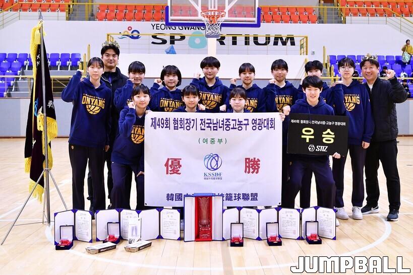 온양여중은 4일 전남 영광군 영광스피티움 국민체육센터에서 열린 제49회 협회장기 전국남녀중고농구 영광대회 여중부 결승전에서 동주여중을 74-63으로 꺾었다. 온양여고는 1쿼터를 18-19로 근소하게 뒤진 이후 2쿼터부터 반격을 개시했고 이후 줄곧 기세를 이어가며 시즌 첫 정상에 등극했다.