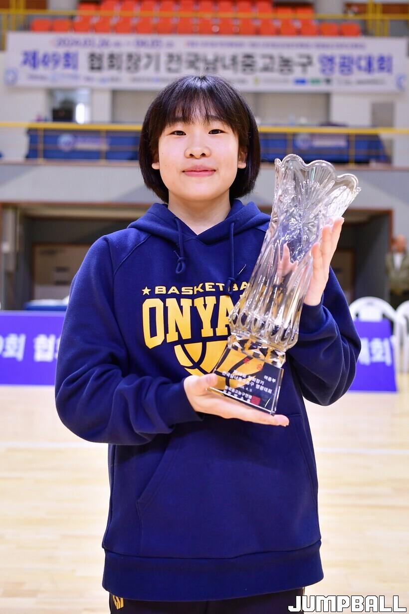 2학년 유은서(163cm, G)는 대회 기간 내내 포인트가드로서 공격을 진두지휘하며 팀 우승에 큰 공을 세웠다. 그는 이날 경기서 풀타임을 소화하며 25점 12리바운드 9어시스트 5스틸 3점슛 2개로 맹폭했다. 전반 17점을 쓸어담으며 예열을 마친 유은서는 후반에도 외곽슛을 터트리는 등 막강한 득점력을 뽐내며 팀 승리에 앞장섰다.
