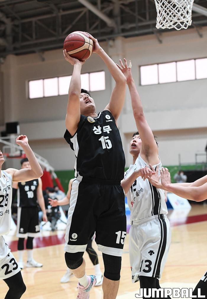 [점프볼=이천/문복주 기자] 31일 이천 LG챔피언스파크 실내농구장에서 열린 2020-2021 KBL D리그 플레이오프 준결승 상무와 LG의 경기, 상무 박세진이 골밑을 작악하고 득점을 하고 있다.