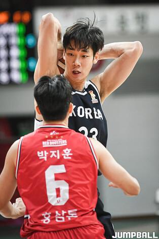 [점프볼=안양/유용우 기자] 25일 안양 정관장 아레나에서 열린 2027 FIBA(국제농구연맹) 농구 월드컵 아시아 예선에 출전하는 남자농구대표팀과 정관장의 연습경기, 대표팀 이현중이 골밑 공격을 시도하고 있다.