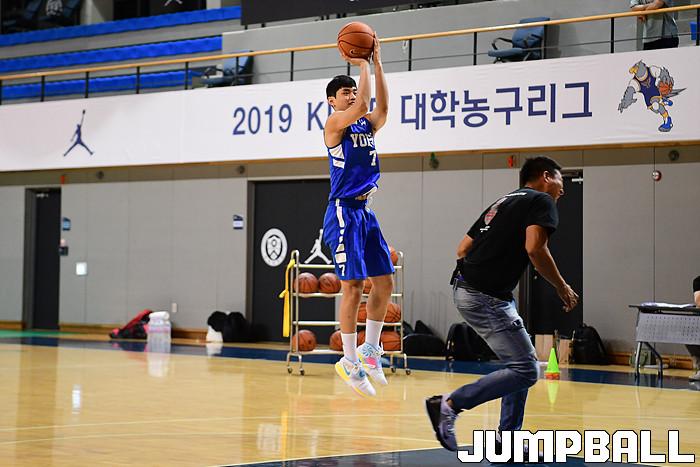 [점프볼=서울/박상혁 기자] 6일 연세대 신촌캠퍼스 체육관에서 대한체육회 주최로 '라이벌 대전' 첫회 녹화가 진행되었다. 연세대는 김택훈이 감독으로 나와 신승민과 양준석, 유기상과 팀을 이루었고, 고려대는 이현호가 감독으로 출전하여 여준형, 최성현, 김태완을 지도했다. 연세대 유기상이 고려대 이현호 감독과의 1 대 1 대결에서 슛을 시도하고 있다.