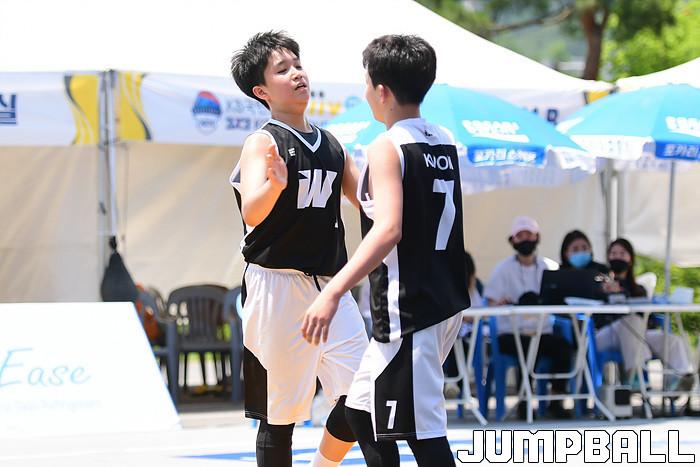 [점프볼=양구/박상혁 기자] 20일 양구청춘체육관 앞 특설코트에서 KB국민은행 LIIV m 3X3 코리아투어 IN 양구 대회가 열렸다. 초등부 팀 W가 환호하고 있다.