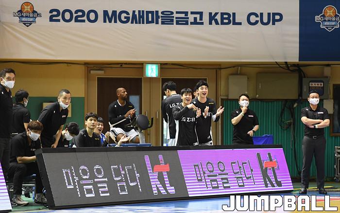 [점프볼=군산/박상혁 기자] 20일 군산월명체육관에서 열린 '2020 MG새마을금고 KBL 컵대회' 창원 LG와 현대모비스 공식 개막전 경기, LG 선수단이 득점을 따내자 환호하고있다.