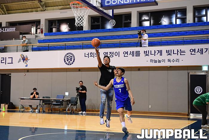[점프볼=서울/박상혁 기자] 6일 연세대 신촌캠퍼스 체육관에서 대한체육회 주최로 '라이벌 대전' 첫회 녹화가 진행되었다. 연세대는 김택훈이 감독으로 나와 신승민과 양준석, 유기상과 팀을 이루었고, 고려대는 이현호가 감독으로 출전하여 여준형, 최성현, 김태완을 지도했다. 고려대 이현호 감독이 연세대 유기상과의 대결에서 레이업 슛을 시도하고 있다.