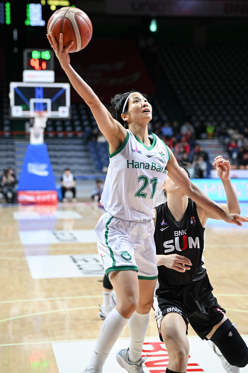 하나은행은 사키의 연장 첫 3점슛으로 다시 한 발 앞섰다. 김소니아에게 점퍼를 내준 뒤 김정은이 달아나는 3점슛까지 터트렸다. 승기를 잡은 하나은행은 BNK의 야투가 빗나가는 틈을 타 점수 차이를 벌리며 승리에 다가섰다.