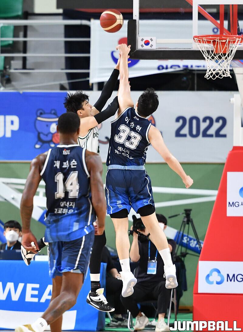 4일 통영체육관에서 열린 2022 MG새마을금고 KBL 컵대회 전주 KCC와 원주 DB의 경기, KCC 이승현이 DB 김종규의 골밑슛을 블로킹하고 있다.