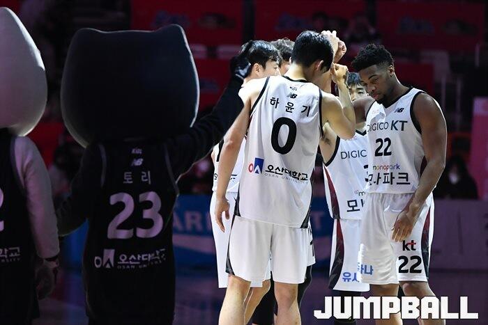 17일 수원 KT 소닉붐 아레나에서 열린 2022-2023 SKT 에이닷 프로농구 수원 KT와 안양 KGC인삼공사의 경기, KT 선수들이 전의를 다지고 있다. [점프볼=수원/유용우 기자]