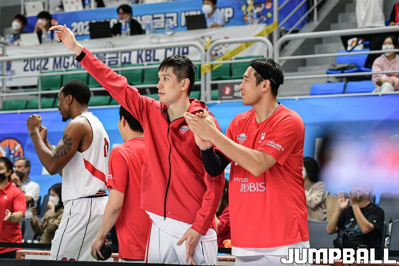 7일 통영체육관에서 열린 2022 MG새마을금고 KBL 컵대회 창원 LG와 울산 현대모비스의 준결승 경기, 현대모비스 장재석과 김현민이 환호하고 있다.