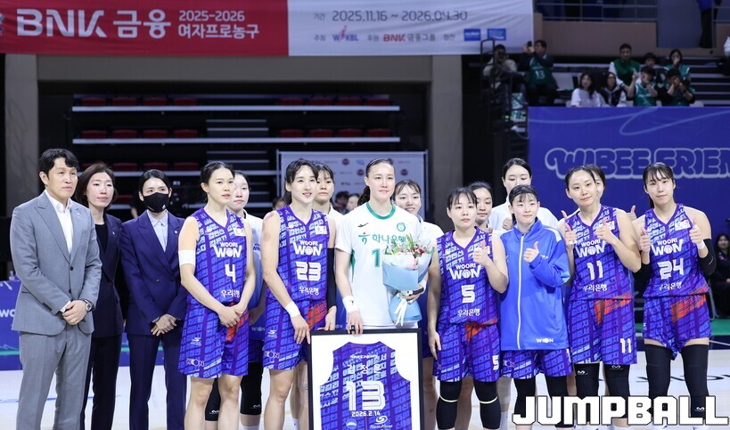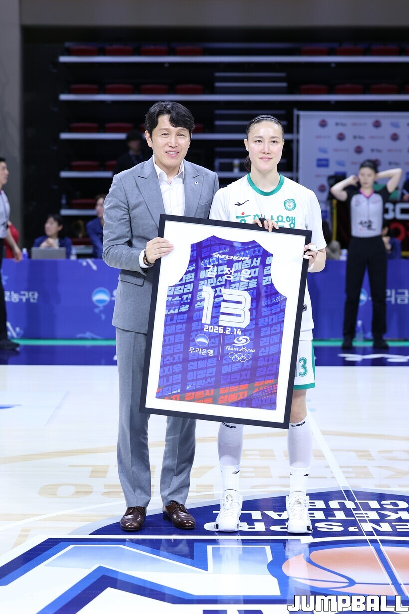 경기 전 은퇴투어 행사가 펼쳐지자 ‘마지막’의 의미가 와닿기 시작했고 감정이 올라왔다. 우리은행은 2026 밀라노·코르티나 동계올림픽 특별 유니폼에 김정은의 등번호(13번)와 이름을 새겨 선물했다. 위성우 감독, 김단비와 인사를 나누고 벤치로 들어온 김정은은 감정이 올라오는 듯했다.