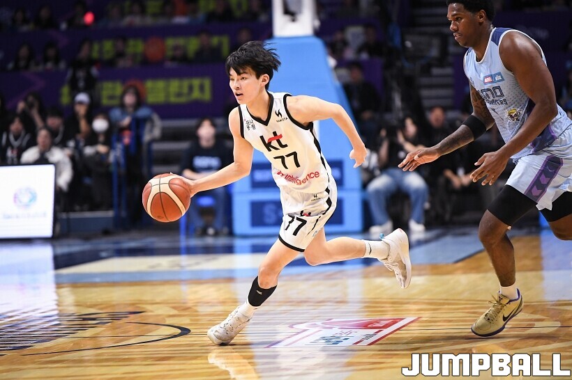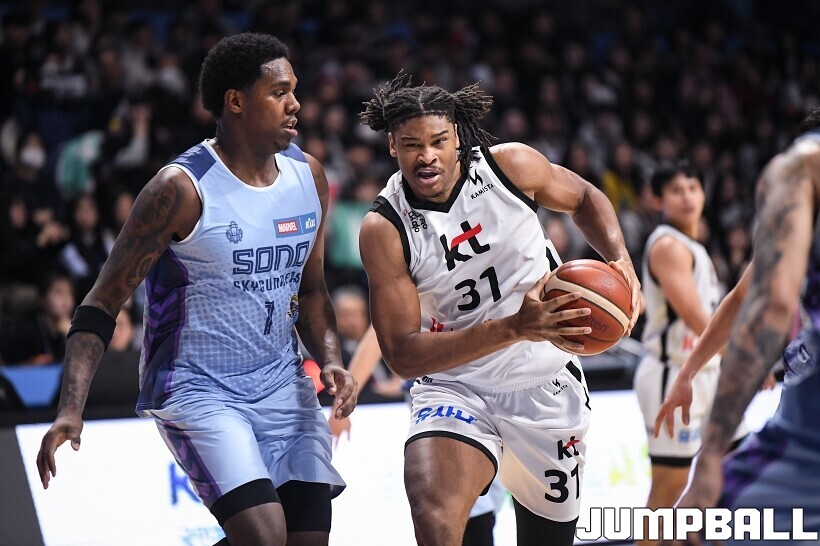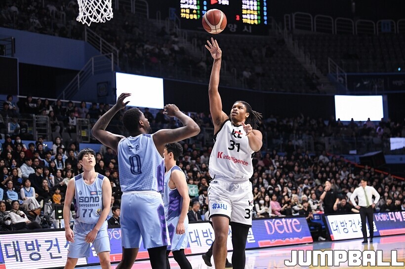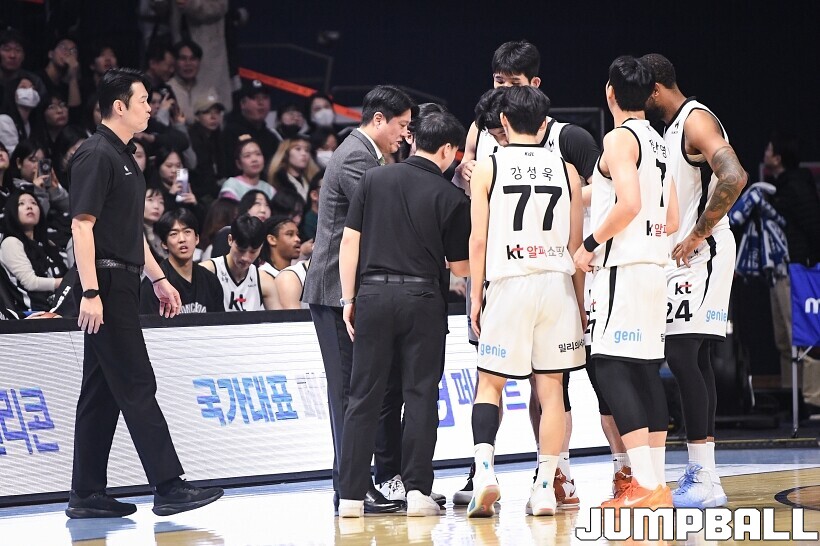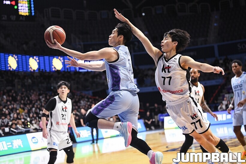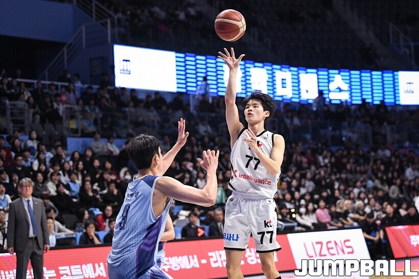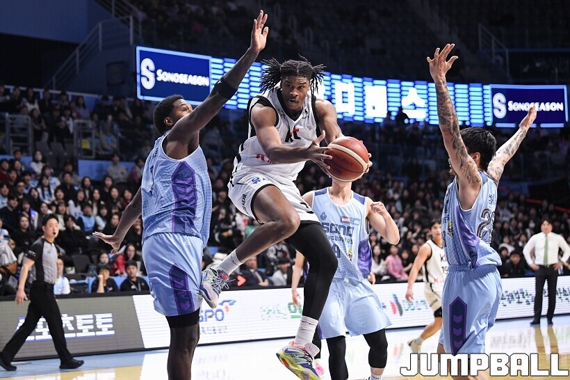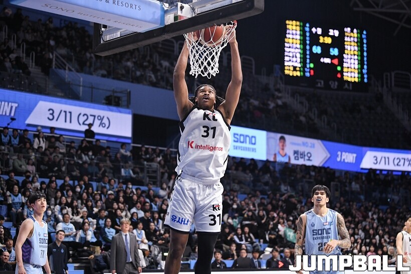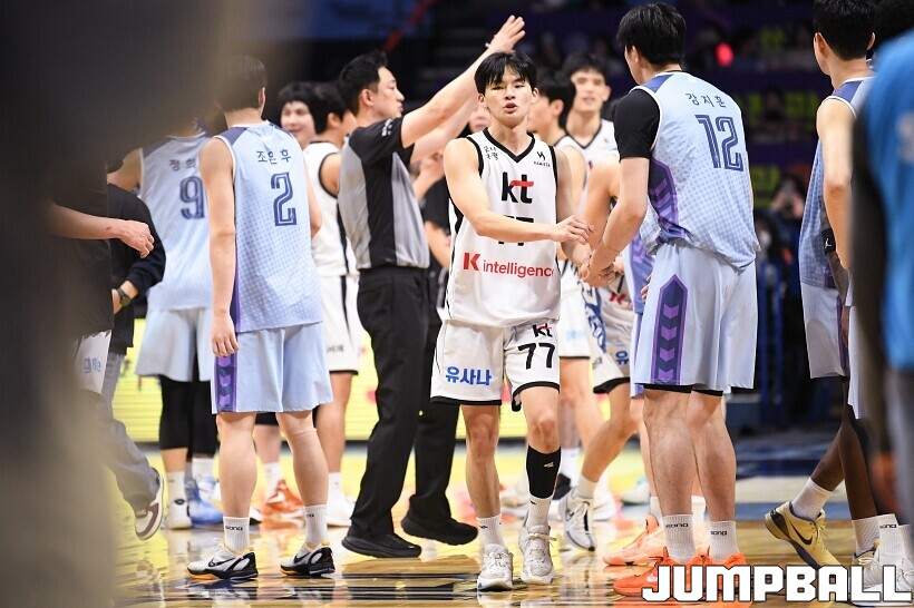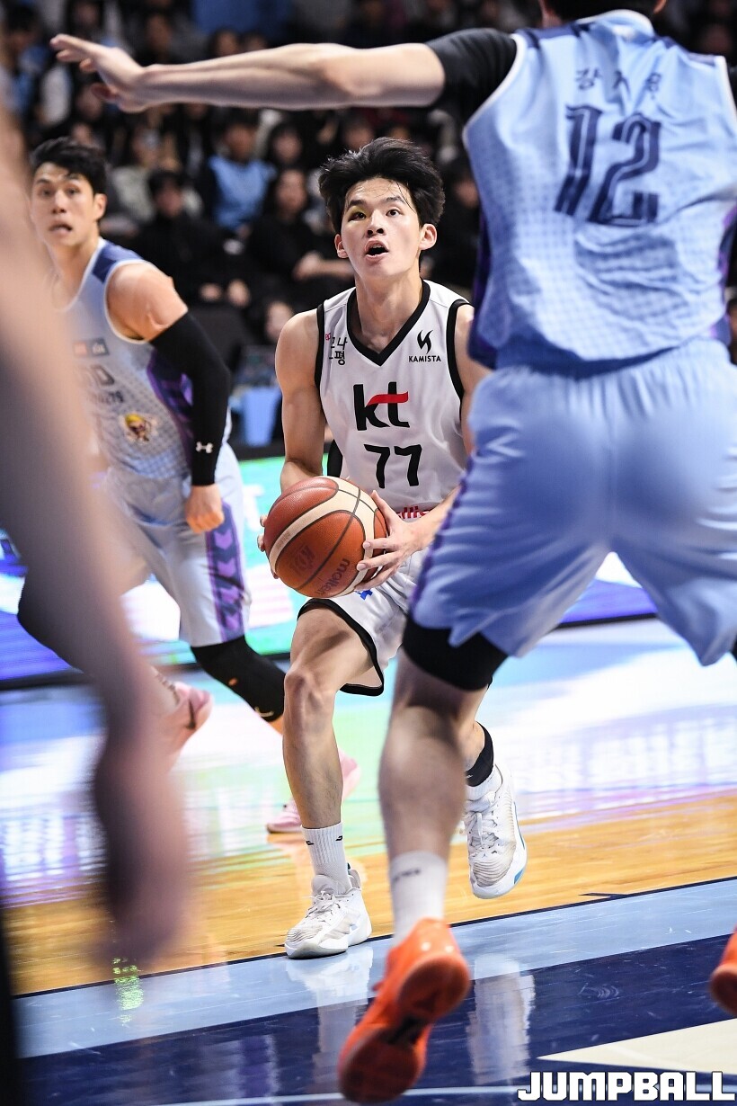 [점프볼=고양/유용우 기자] 3일 고양 소노 아레나에서 열린 2025-2026 LG전자 프로농구 고양 소노와수원 KT의 경기, 아이재아 힉스와 신인 강성욱이 36점을 합작한 KT가 76-64로 소노에 원정 승리를 거뒀다. 소노는 나이트 18점, 켐바오 17점 등 올리며 분전했지만 출전한 선수가 고른 득점을 올린 KT에 밀리며 패했다.