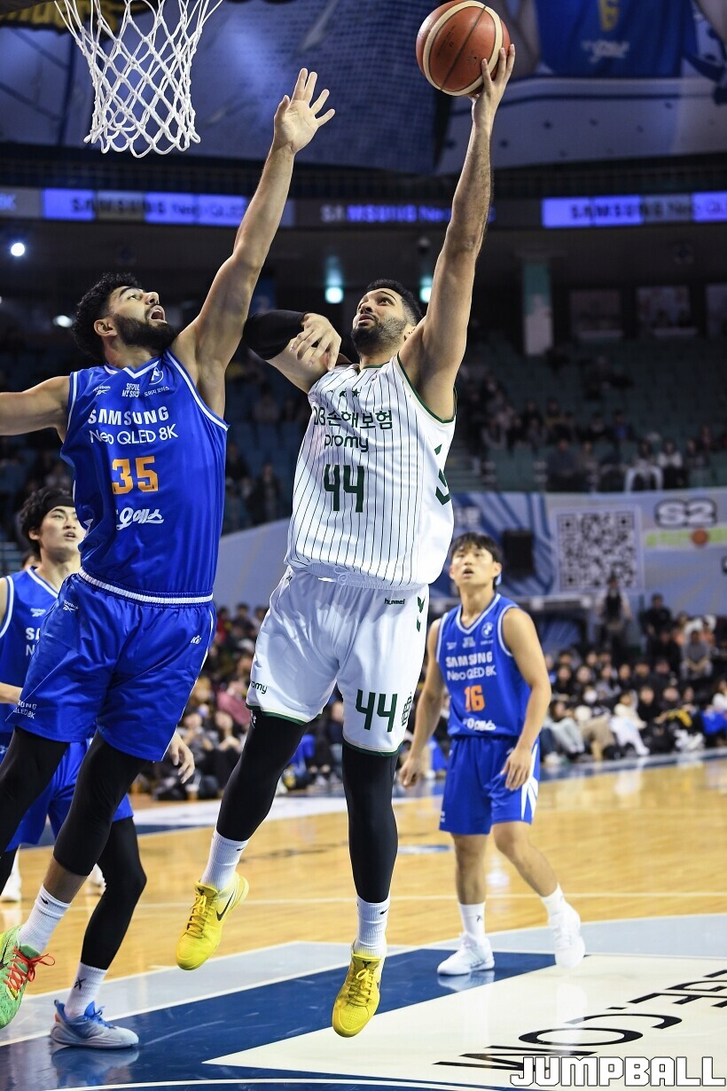 [점프볼=잠실/유용우 기자] 4일 잠실실내체육관에서 열린 2025-2026 LG전자 프로농구 서울 삼성과 원주 DB의 경기, DB 무스타파가 삼성 칸터의 수비를 두고 공격을 시도하고 있다.