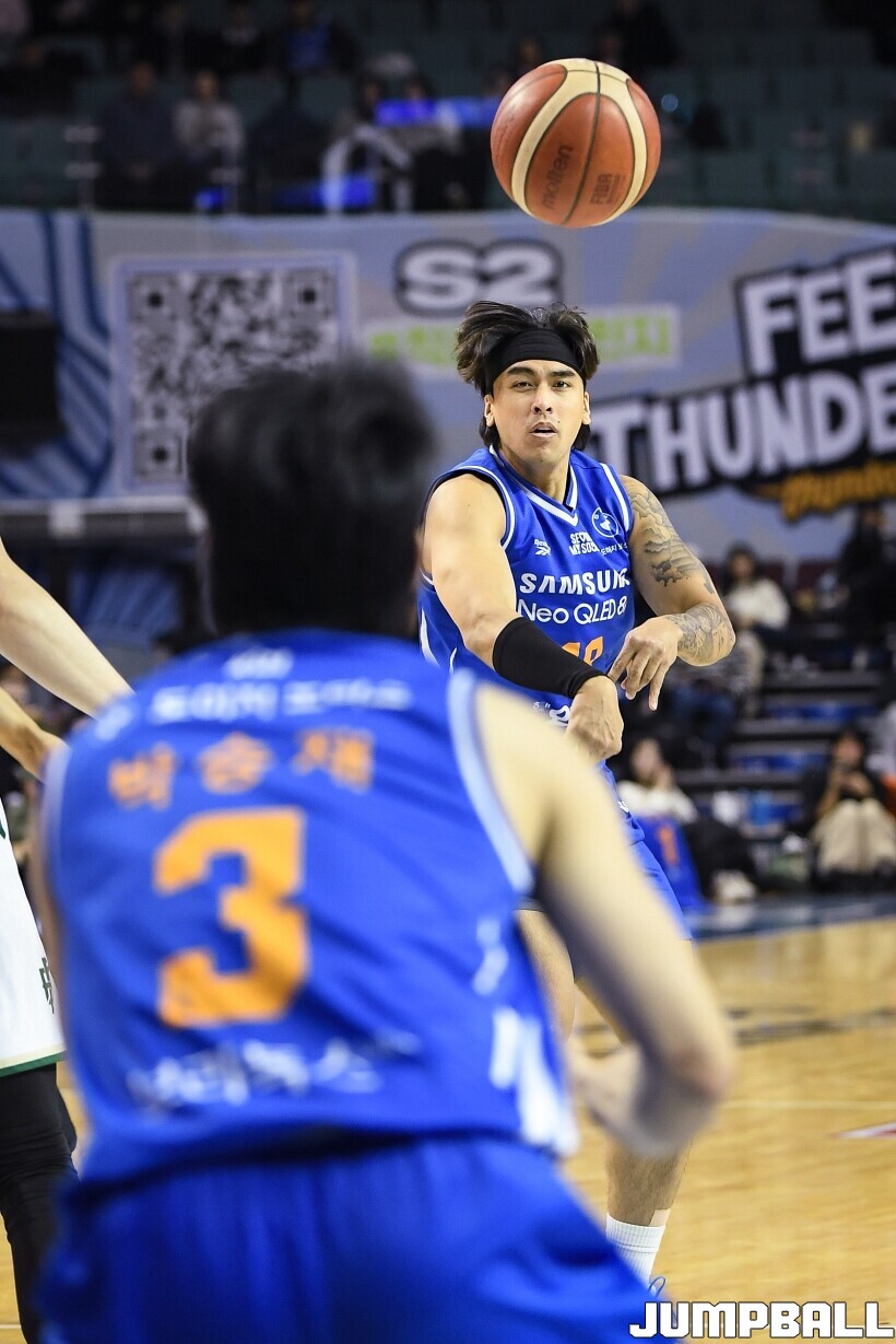 [점프볼=잠실/유용우 기자] 4일 잠실실내체육관에서 열린 2025-2026 LG전자 프로농구 서울 삼성과 원주 DB의 경기, 삼성 구탕이 골밑으로 패스를 넣어주고 있다.