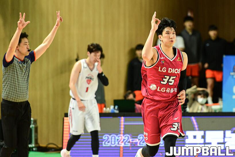 7일 통영체육관에서 열린 2022 MG새마을금고 KBL 컵대회 창원 LG와 울산 현대모비스의 준결승 경기, LG 서민수가 3점슛을 성공시킨후 백코트 하고 있다.