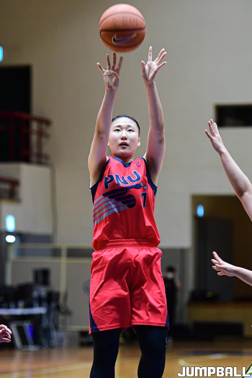 27일 수원대 체육관에서 열린 2022 KUSF 대학농구 U-리그 수원대와 부산대의 경기, 부산대 이경은이 점프슛을 시도하고 있다.
