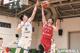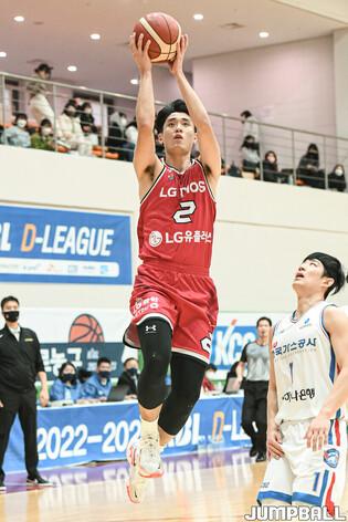 12일 이천 LG챔피언스파크에서 열린 2022-2023 KBL D리그 창원 LG와 대구 한국가스공사의 경기, LG 박인태와 한국가스공사 최주영이 리바운드 다툼을 하고 있다.