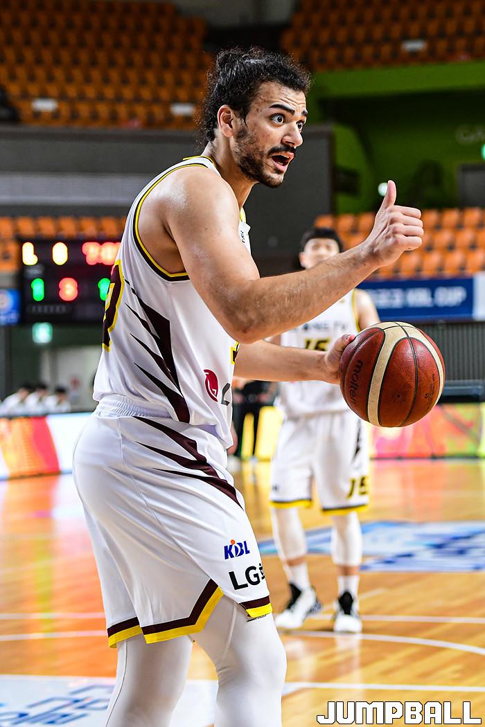[점프볼=상주/박상혁 기자] 11일 경상북도 상주시 상주실내체육관에서 열린 '2021 MG새마을금고 KBL컵 대회' 창원 LG와 전주 KCC 경기, LG 아셈 머레이가 심판에게 사인을 보내고 있다.