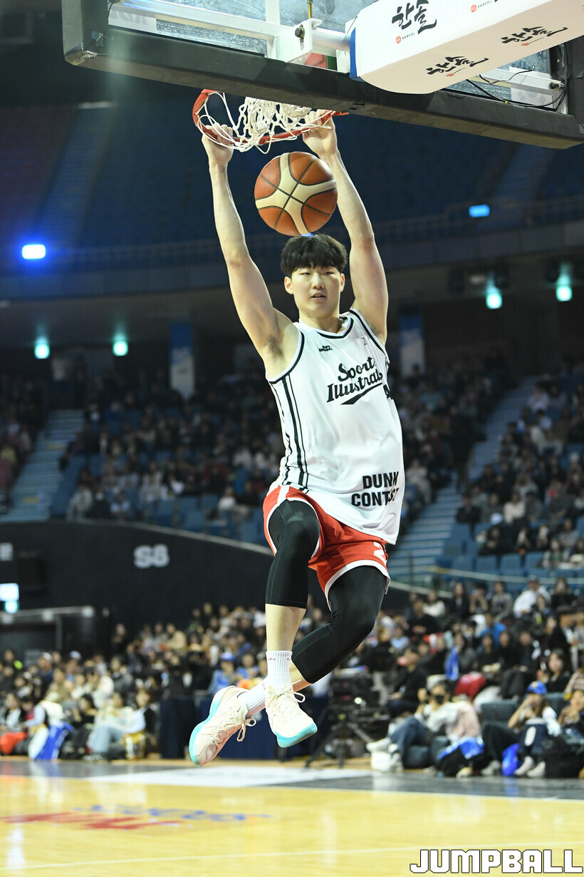 17일 잠실체육관에서 열린 2025-2026 LG전자 프로농구 올스타게임 전야제 스포츠일러스트레이티드(SI) 덩크 콘테스트 예선. 총 7명이 출전한 가운데 단연 돋보이는 건 김명진이었다. 김명진은 폭발적인 탄력을 활용해 덩크슛을 모두 성공시키며 50점 만점으로 결선 진출에 성공했다.