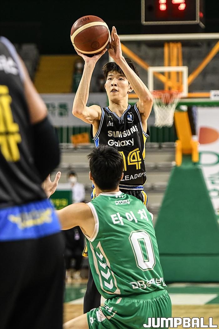 [점프볼=원주/박상혁 기자] 9일 원주종합체육관에서 열린 2020-2021 현대모비스 프로농구 원주DB와 서울삼성 개막전 경기, 삼성 김진영이 3점슛을 시도하고 있다.