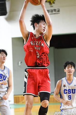 [점프볼=안암/박상혁 기자] 2일 고려대 화정체육관에서 열린 2024 KUSF 대학농구 U-리그 고려대와 조선대의 경기, 고려대 윤기찬이 3점슛을 성공시킨 후 세리머니를 하고 있다.