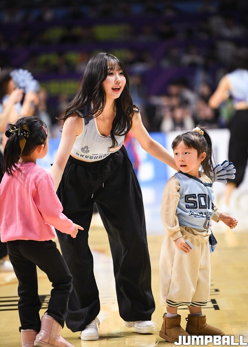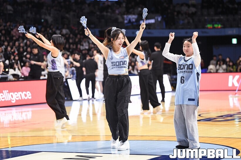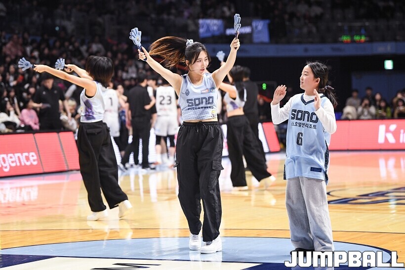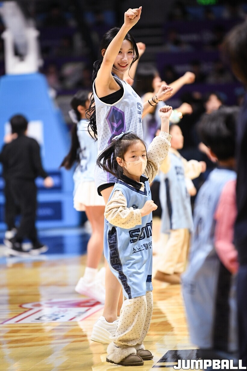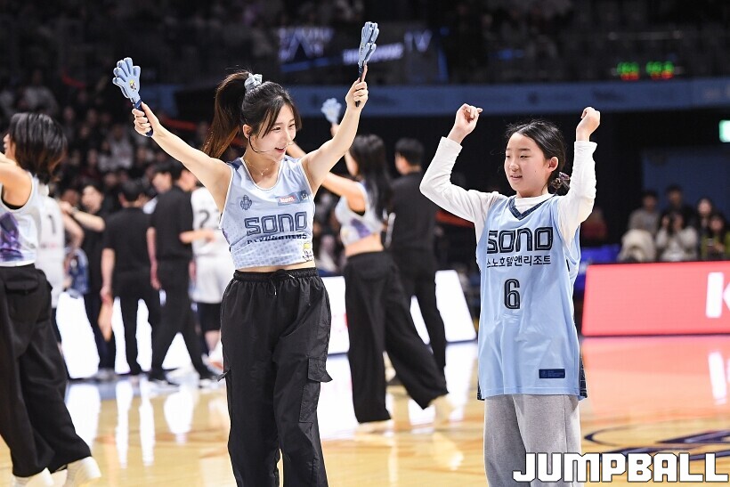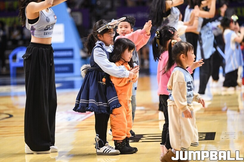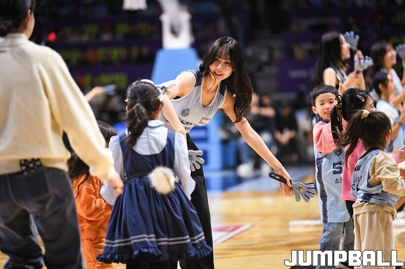[점프볼=고양/유용우 기자] 3일 고양 소노 아레나에서 열린 2025-2026 LG전자 프로농구 고양 소노와수원 KT의 경기, 소노 치어리더들이 어린이 팬들을 코트로 이끌며 즐거운 응원전을 펼치고 있다.