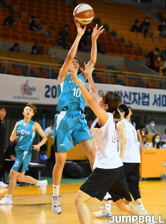 [점프볼=청주/문복주 기자]  16일부터 21일까지 청주체육관에서 '2020 우리은행 박신자컵 서머리그' 하나원큐와 신한은행의 경기, 하나원규 강유림이 상대수비를 앞에두고 점프슛을 시도하고 있다.