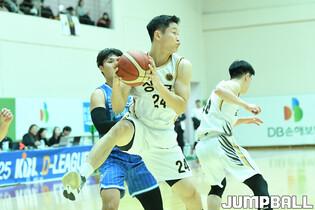 [점프볼=이천/유용우 기자] 17일 이천 LG챔피언스파크에서 열린 2024-2025 KBL D리그 대구 한국가스공사와 상무의 경기, 상무 김준환이 패스를 내주고 있다.