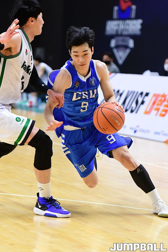 [점프볼=수원/박상혁 기자] 25일 서수원칠보체육관에서 열린 2021 KUSF 대학농구 U-리그 건국대와 조선대의 경기, 조선대 김환이 돌파를 시도하고 있다.