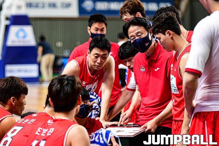 14일 경상북도 상주시 상주실내체육관에서 열린 2021 MG새마을금고 KBL컵 대회 고양 오리온과 안양 KGC인삼공사의 경기, 오리온 강을준 감독이 선수들에게 지시를 하고 있다.