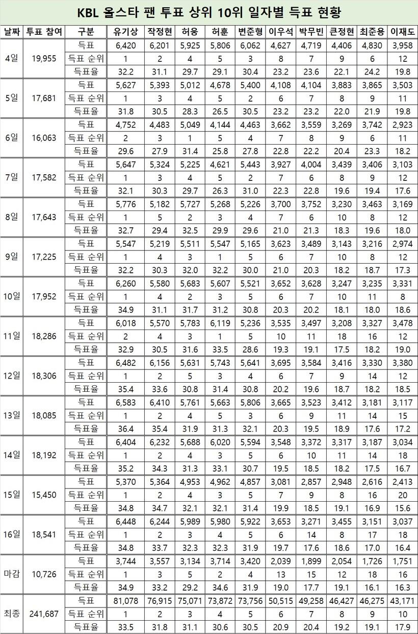 KBL은 지난 3일부터 16일까지 14일간 KBL 올스타 팬 투표를 진행했다. 최종 투표 참여 인원은 241,687명이다. 이는 역대 4위다.
