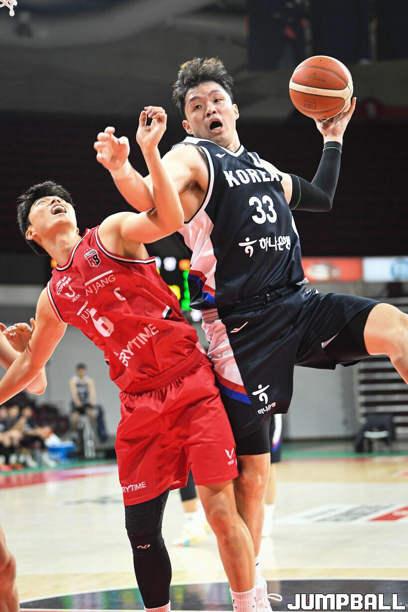 [점프볼=안양/유용우 기자] 25일 안양 정관장 아레나에서 열린 2027 FIBA(국제농구연맹) 농구 월드컵 아시아 예선에 출전하는 남자농구대표팀과 정관장의 연습경기, 대표팀 이승현이 리바운드를 잡고 있다.