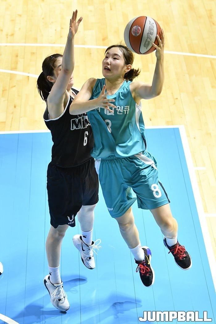 [점프볼=청라/유용우 기자]  7일 인천 서구 하나글로벌캠퍼스에 위치한 하나은행 연습체육관에서 열린 하나원큐와 삼성생명의 연습경기, 하나원큐 김지영이 공격을 시도하고 있다.