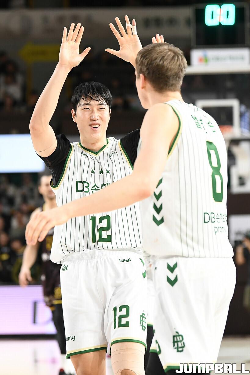 [점프볼=창원/유용우 기자] 21일 창원실내체육관에서 열린 2025-2026 LG전자 프로농구 창원 LG와 원주 DB의 경기, DB 정효근이 엘런슨과 하이파이브를 하고 있다.