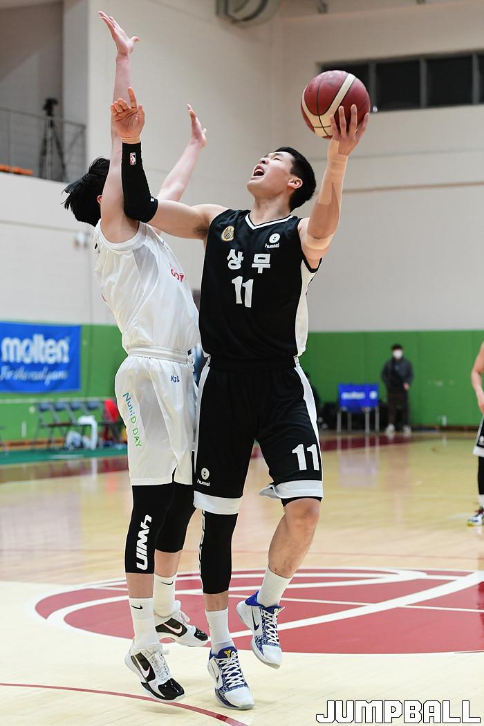 [점프볼=이천/박상혁 기자] 4일 경기도 이천 LG챔피언스파크에서 열린 2020-2021 KBL D리그 1차대회 SK와 상무의 결승전 경기, 상무 김진용이 골밑에서 슛을 시도하고 있다.