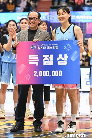 8일 인천도원체육관에서 열린 신한은행 SOL 2022-2023 여자프로농구 올스타 페스티벌, 핑크스타가 블루스타에 98-92로 승리했다. 진안이 베스트 퍼포먼스상을 수상하고 있다.
