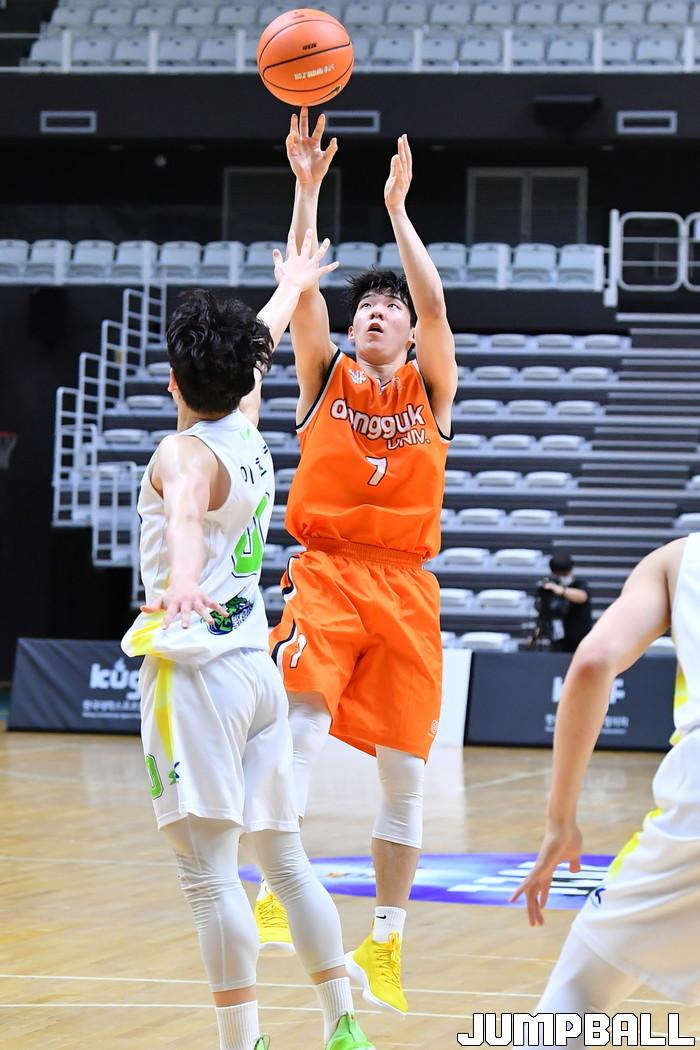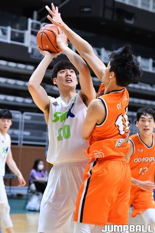 [점프볼=수원/홍기웅 기자] 5일 수원 서수원칠보체육관에서 열린 '2021 KUSF 대학농구 U-리그 3차대회' 동국대와 성균관대의 경기. 동국대 이승훈이 점프슛을 던지고 있다.