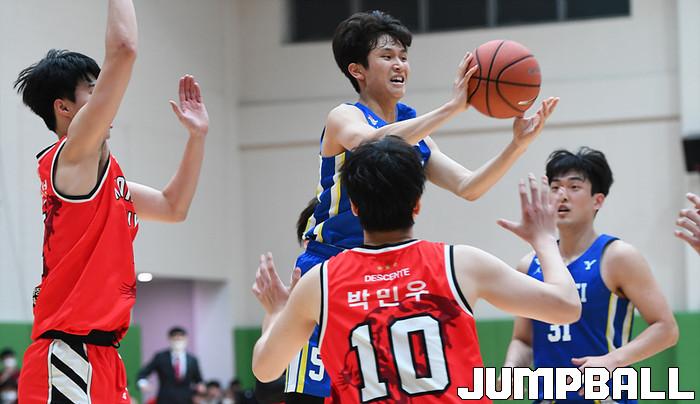[점프볼=이천/문복주기자] 18일 경기도 이천 LG챔피언스파크에서 열린 2020 KUSF 대학농구 U-리그 남대부 결승전으로 고려대와 연세대의 경기, 연세대 양준석이 골밑 중앙에서 외곽으로 패스를 하고 있다.