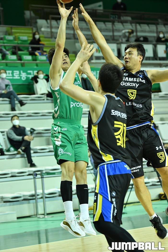 [점프볼=원주/유용우 기자] 27일 원주 종합체육관에서 열린 2020-2021 현대모비스 프로농구 원주 DB와 서울 삼성의 경기, DB 김훈이 3점슛을 시도하고 있다.