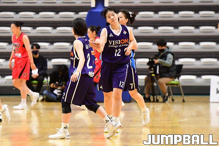 [점프볼=수원/박상혁 기자] 29일 서수원칠보체육관에서 열린 2020 KUSF 대학농구 U-리그 부산대와 전주비전대의 여대부 결승전 경기, 전주비전대 김승리와 김미현이 하이파이브를 하고 있다.