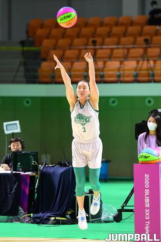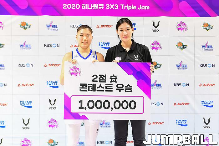 [점프볼=청라/박상혁 기자] 21일 인천 서구 하나글로벌캠퍼스에 위치한 하나은행 연습체육관에서 열린 '2020 하나원큐 3X3 TRIPLE JAM (트리플잼)' 1차 대회 2점슛 컨테스트 결선, 우리은행 나윤정이 컨테스트에서 우승을 차지하였다.