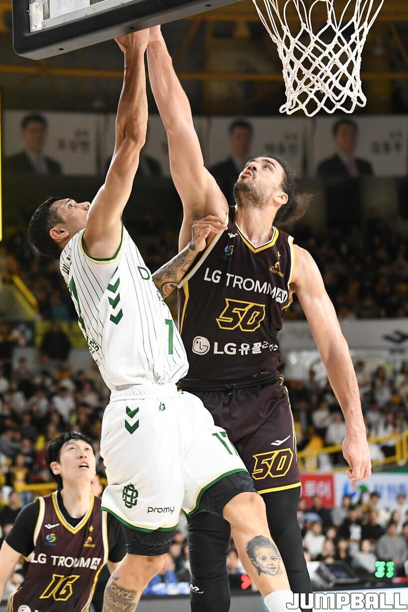[점프볼=창원/유용우 기자] 21일 창원실내체육관에서 열린 2025-2026 LG전자 프로농구 창원 LG와 원주 DB의 경기, LG 마레이가 DB 알바노의 공격을 블록으로 저지하고 있다.