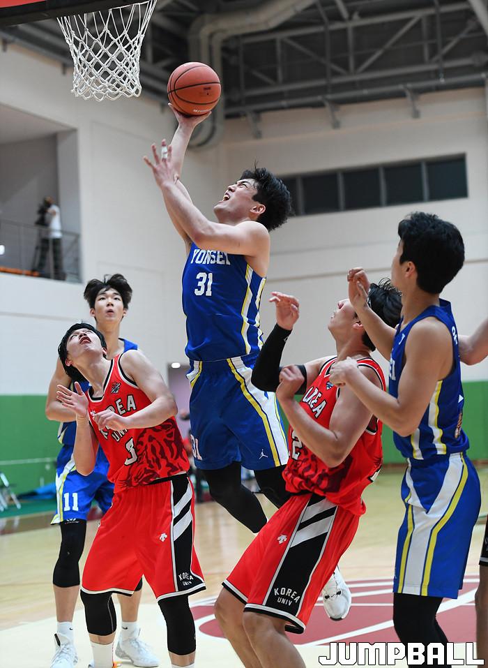 [점프볼=이천/문복주기자] 18일 경기도 이천 LG챔피언스파크에서 열린 2020 KUSF 대학농구 U-리그 남대부 결승전으로 고려대와 연세대의 경기, 연세대 신승민이 골밑에서 공격리바운드로 상대의 수비를 뿌리치고 슛을 시도하고 있다.