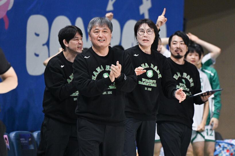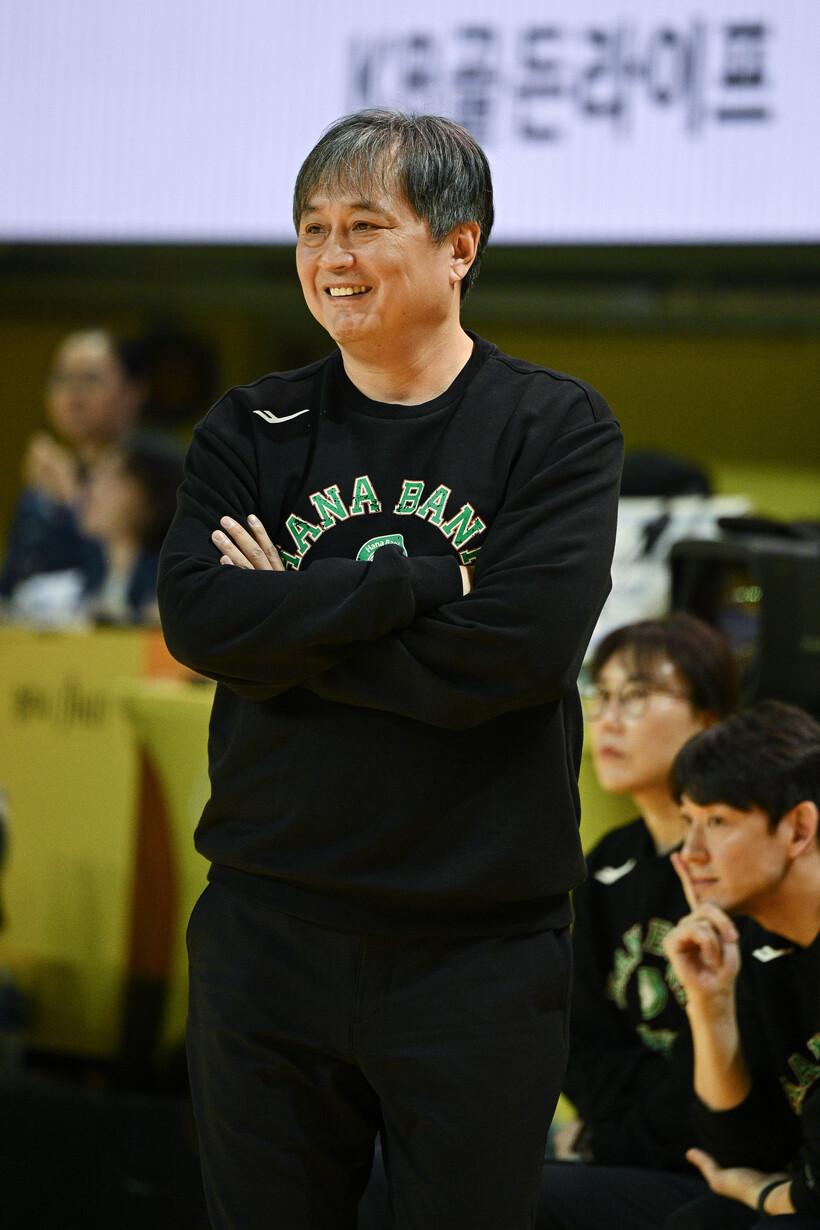 이상범 감독과 하나은행 코칭스태프는 28일 청주KB챔피언스파크에서 벌어진 BNK금융 2025-2026 여자프로농구 원정경기에서 어김없이 구단 맨투맨 티셔츠를 입었다.