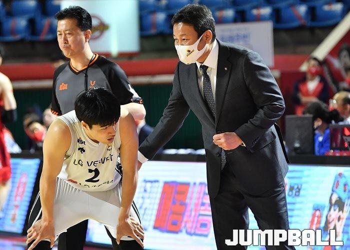 [점프볼=잠실/유용우 기자] 04일 잠실학생체육관에서 열린 2020-2021 현대모비스 프로농구 서울 SK와 창원 LG의 경기, LG 조성원 감독이 정성우에게 작전을 지시하고 있다.
