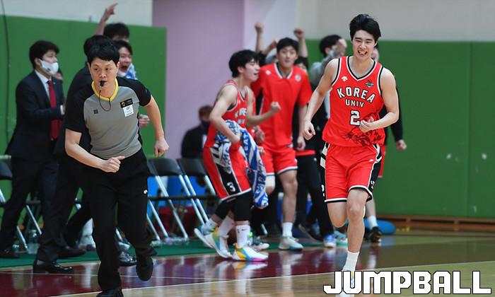 [점프볼=이천/문복주기자] 18일 경기도 이천 LG챔피언스파크에서 열린 2020 KUSF 대학농구 U-리그 남대부 결승전으로 고려대와 연세대의 경기, 고려대 신민석이 3점슛을 성공시키고 환호하고 있다.