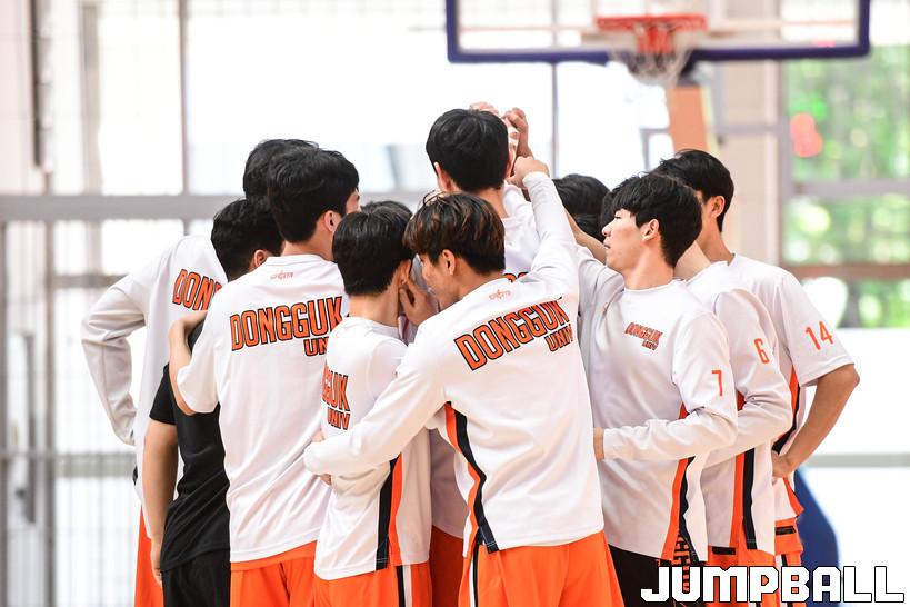 6일 동국대학교 서울캠퍼스 체육관에서 열린 2022 KUSF 대학농구 U리그 동국대와 상명대의 경기, 동국대 선수들이 화이팅을 외치고 있다.