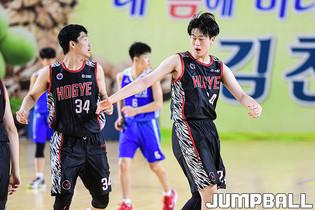 20일 김천실내체육관에서 열린 2021 연맹회장기 전국남녀중고농구 김천대회 남고부 홍대부고와 양정고의 경기, 벤치에 있는 양정고 선수단이 환호하고 있다.